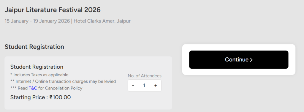 - Click on that option, and you will be redirected to the JLF 2026 ticket details, categorised by category.